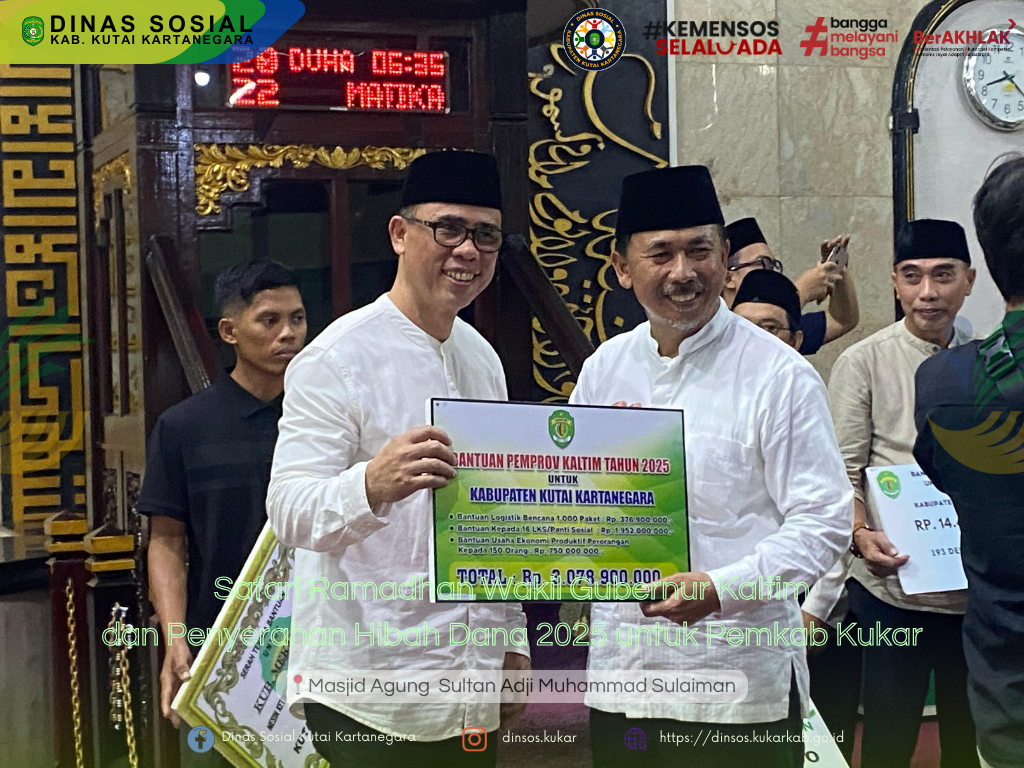 Acara dimulai dengan buka puasa bersama, dilanjutkan dengan shalat maghrib, makan malam, dan shalat isya. Setelah itu, Wakil Gubernur Seno Aji secara simbolis menyerahkan bantuan hibah dana tahun 2025 kepada 32 lembaga di Kabupaten Kutai Kartanegara. Dinas Sosial menerima Dana Hibah senilai Rp. 3.078.900.000,- dengan rincian, Bantuan Logistik Bencana 1.000 Paket, Bantuan Kepada 16 LKS (Lembaga Kesejahteraan Sosial) / Panti Sosial, dan Bantuan Usaha Ekonomi Produktif Perorangan Kepada 150 Orang. Penyerahan tersebut diterima langsung oleh Sekretaris Daerah (Sekda) Kukar, Sunggono, sebelum kegiatan ditutup dengan shalat tarawih bersama.