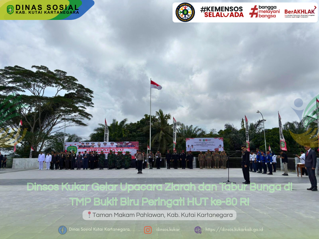 TENGGARONG – Dalam rangka memperingati Hari Ulang Tahun ke-80 Kemerdekaan Republik Indonesia, Dinas Sosial Kabupaten Kutai Kartanegara melalui Bidang Penanganan Korban Bencana dan Pengelolaan Taman Makam Pahlawan (TMP) menyelenggarakan Upacara Ziarah dan Tabur Bunga pada Minggu, 17 Agustus 2025, pukul 09.30 WITA di Taman Makam Pahlawan Bukit Biru Tenggarong.