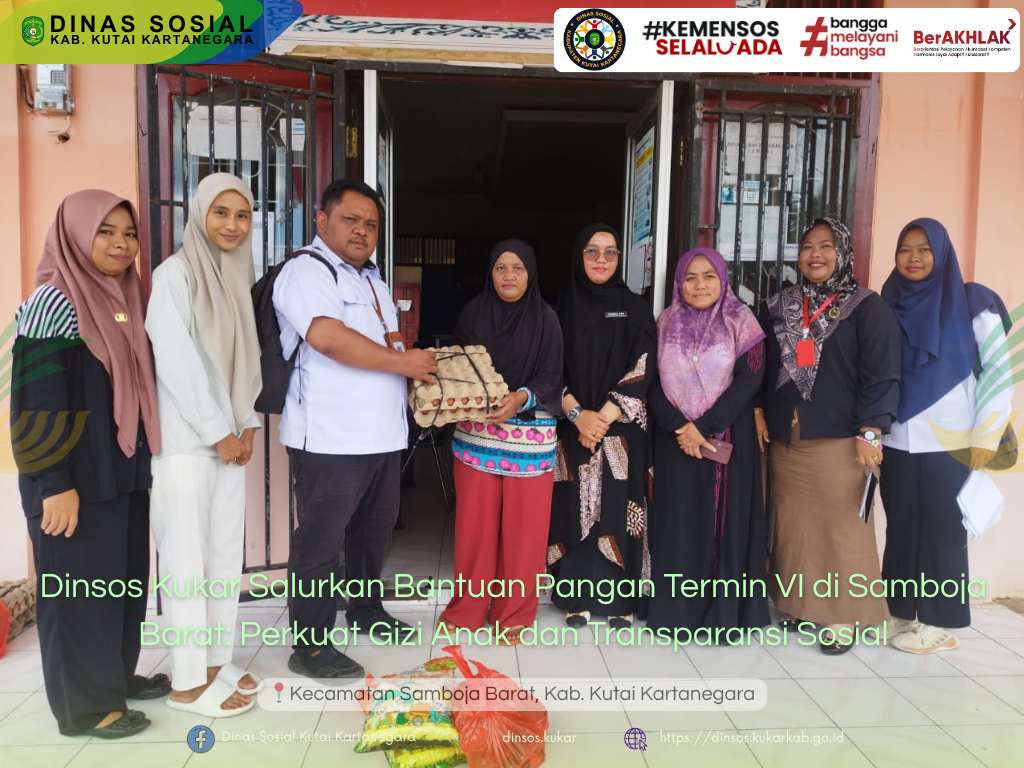 KUTAI KARTANEGARA – Dalam rangka mendukung program prioritas nasional dan daerah terkait penanggulangan kemiskinan ekstrem serta peningkatan status gizi masyarakat rentan, Dinas Sosial Kabupaten Kutai Kartanegara melaksanakan kegiatan distribusi bantuan permakanan bagi kelompok rentan di 20 kecamatan, termasuk Kecamatan Samboja Barat pada tanggal 12 – 14 November 2025, sebagai salah satu lokasi strategis pelaksanaan Termin VI Tahun 2025.
