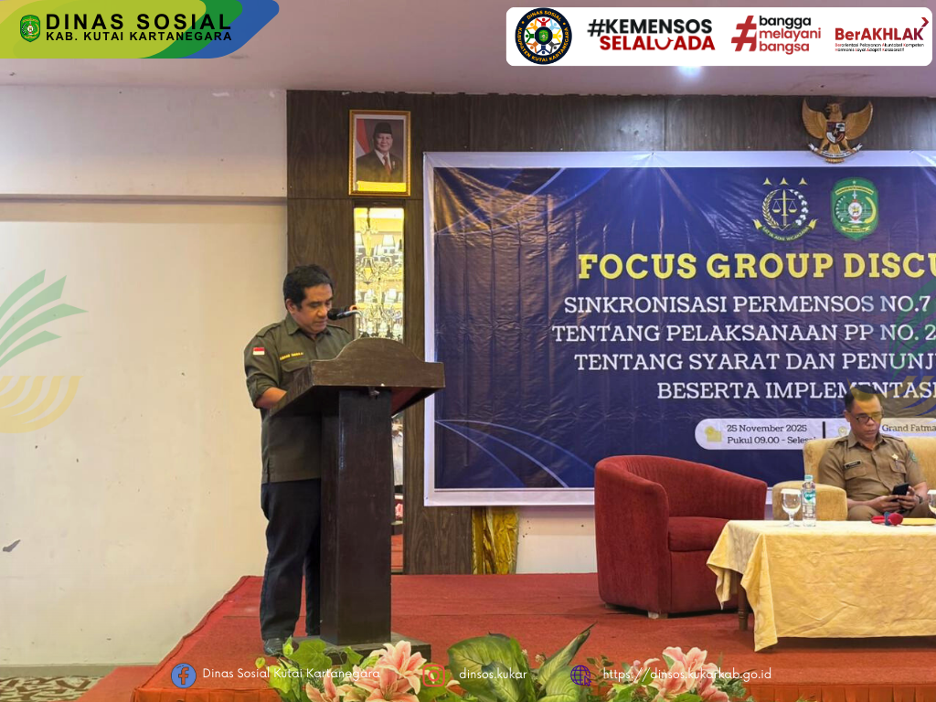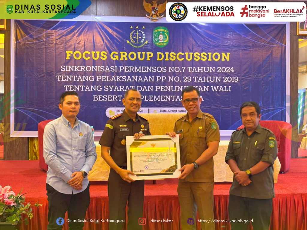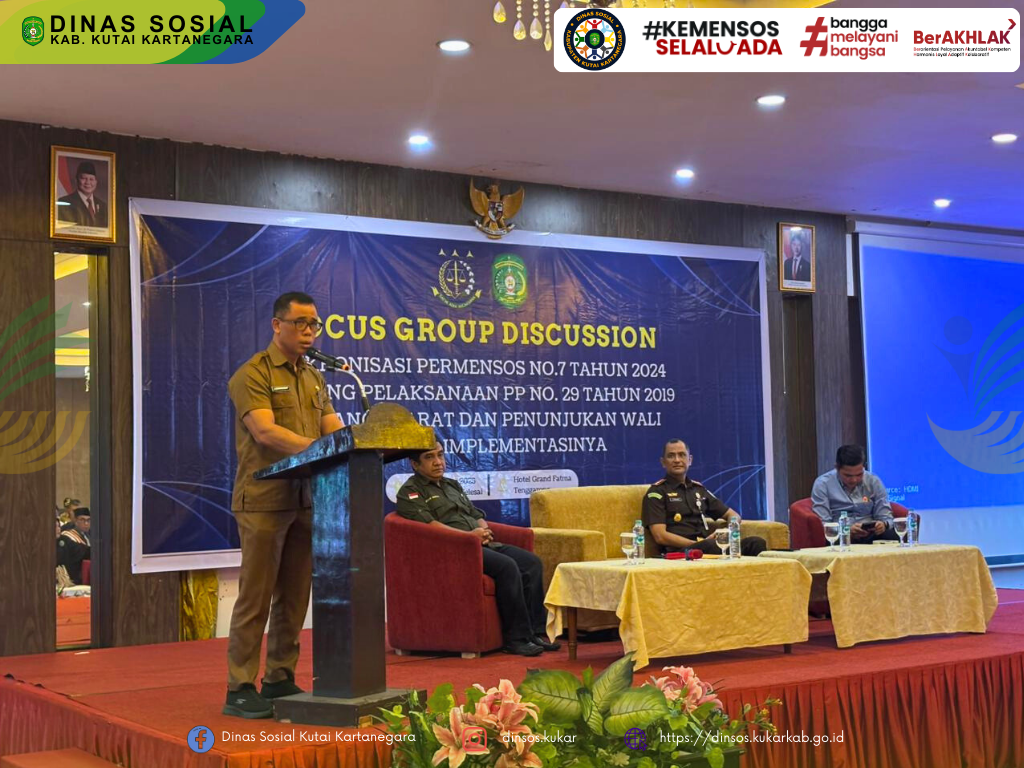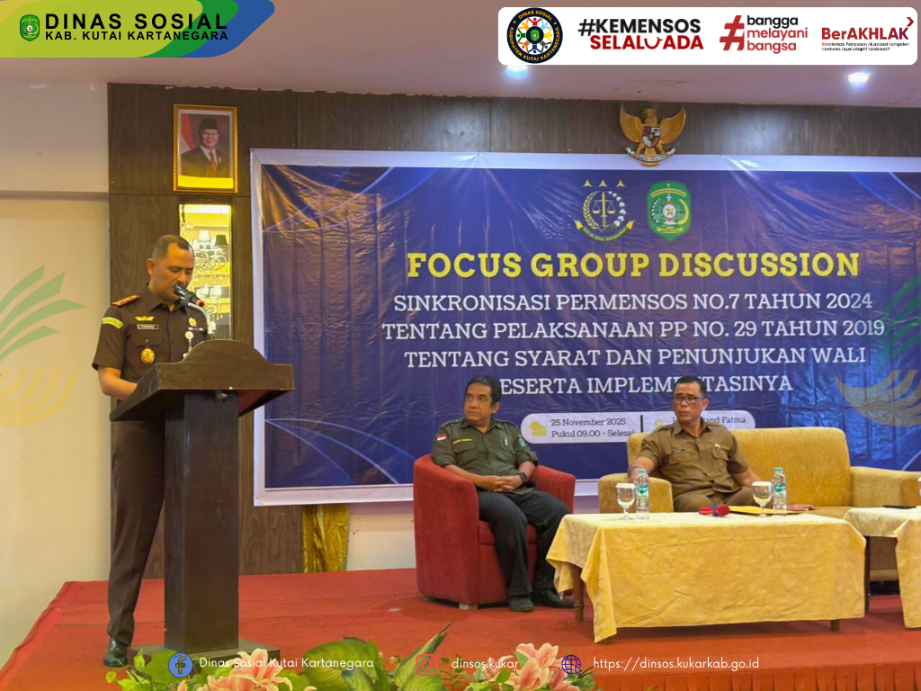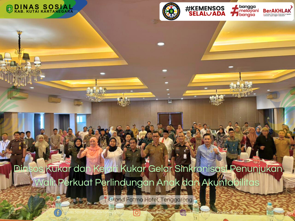 TENGGARONG, 25 November 2025 – Dinas Sosial Kabupaten Kutai Kartanegara bersama Kejaksaan Negeri Kukar menggelar kegiatan Sinkronisasi Permensos No. 7 Tahun 2024 dan Implementasi Perjanjian Kerja Sama (PKS) di Hotel Grand Fatma, Tenggarong. Kegiatan ini merupakan tindak lanjut dari Peraturan Pemerintah Nomor 29 Tahun 2019 tentang syarat dan tata cara penunjukan wali, yang bertujuan memastikan perlindungan dan pengasuhan anak berjalan akuntabel serta sah secara hukum.